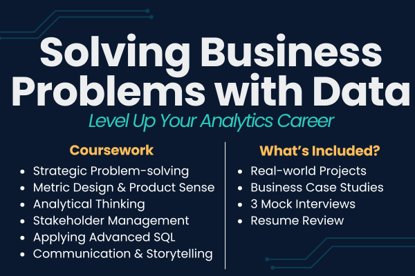 In this live, hands-on accelerator (limited to <20 participants), you'll master the entire analytics workflow: framing ambiguous problems, asking the right questions, structuring analysis, writing SQL with business context, and crafting narratives that drive action. You'll work through real-world projects and multiple problem-solving case studies, developing the mindset of a top-tier consultant. This isn't about learning tools but about learning how to think, solve and influence. The focus will be on real-world application.